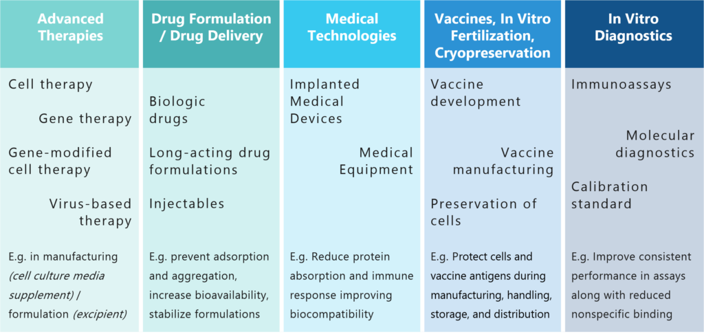 Ancillary material for advanced therapies, media supplement for cell culture – Recombinant human albumin can promote cell growth, viability and productivity across various cell types, supporting applications from R&D to large-scale bioproduction of advanced therapies.